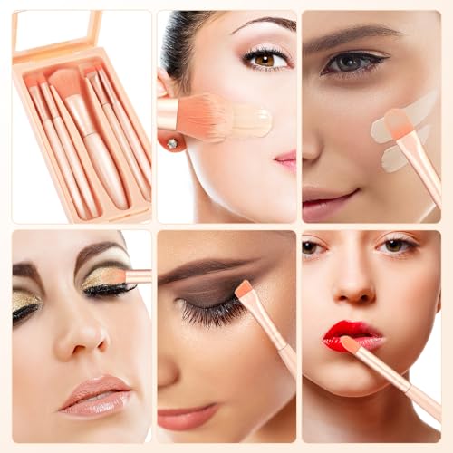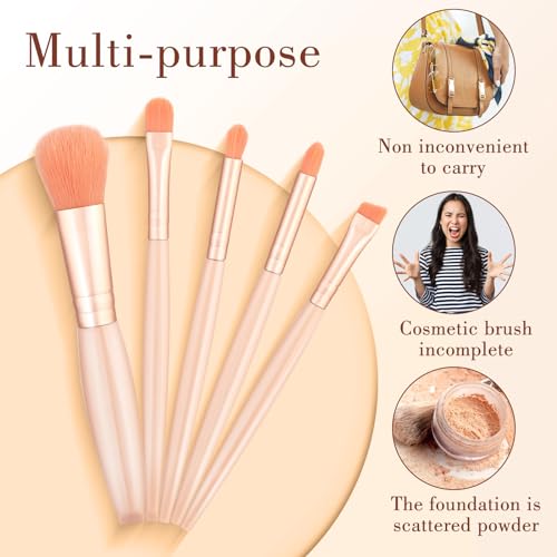 Mini Travel Makeup Brush Set with Case, 5 Pcs Complete Function Travel Size Makeup Brushes Built-In Mirror, Portable Travel Small Makeup Brush for Blush Eyeshadow Foundation