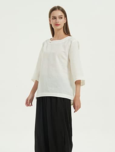 Minibee Women’s Loose Cotton Linen Blouse Round Neck with Chinese Frog Button Tops