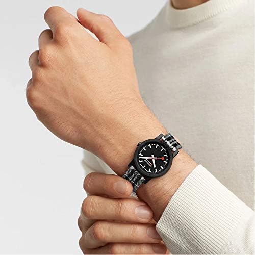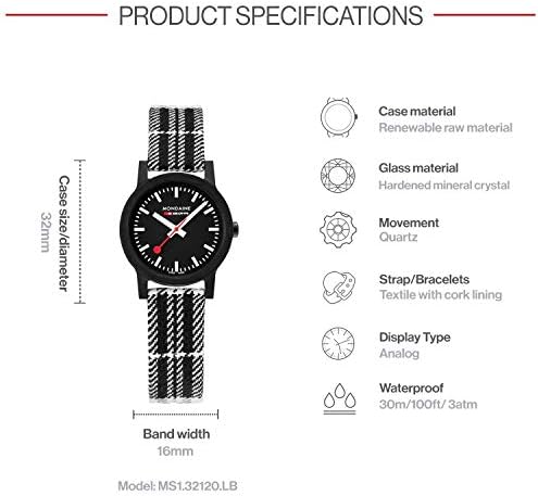 Black dial enhanced by white hands. Black-plated renewable raw material case with a black and white pattern textile (cork backed) band. Quartz movement. 30 meters / 100 feet water resistance. Fixed bezel. Scratch Resistant Mineral crystal. Solid caseback. Tang clasp. Pull / Push crown. Case size 32 mm x 15 mm. Band 16 mm x long. Mondaine MS1.32120.LB ESSENCE Watch.