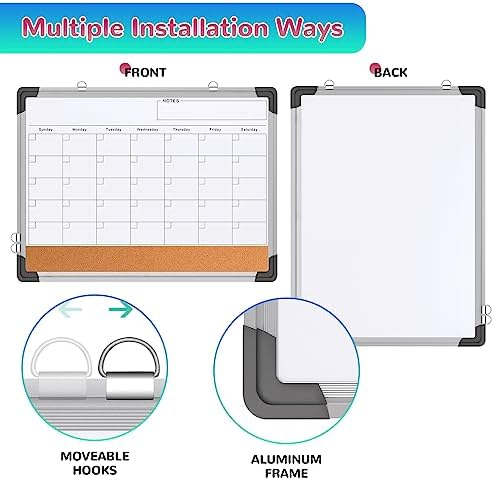 3 in 1 Combo Calendar White/Cork Board: Our monthly whiteboard can put your life in order and plan ahead. Magnetic dry erase calendar combo board includes cork strip across the bottom. Perfect for pinning notes, messages, pictures, memos, calendars, menus, reminders and more. The magnetic double-sided whiteboard allows you to have two projects going. The other sided is blank. It is the best tool for home teaching or memo. It can hang on wall to remind you not forget the important thing.