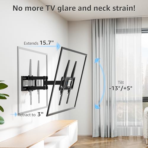 OPTIMAL VIEWING EXPERIENCE – Full motion TV mount moves freely to tilt the screen up 5° and down 13° for reducing glare, and swivel TV left or right 45° for comfortable viewing angles. TV bracket provides post-install 3° leveling capability and supports 3″ to 15.7″ wall distance adjust flexibility.