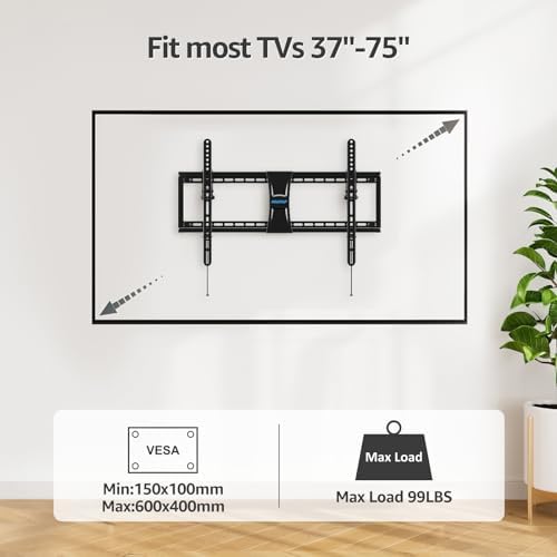 UNIVERSAL TV WALL MOUNT – The tilting TV wall mount is compatible with most 37-75 inches flat screen or curved TVs up to 99 lbs. Fits VESA 150x100mm to 600x400mm mounting patterns. Design for wood studs spacing up to 24 inches. NOTE: Not for alone drywall application.