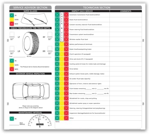 🚗 𝐕𝐈𝐁𝐑𝐀𝐍𝐓 𝐅𝐔𝐋𝐋-𝐂𝐎𝐋𝐎𝐑 𝐏𝐑𝐈𝐍𝐓𝐈𝐍𝐆: To enhance both aesthetic appeal and functional clarity, all sections of our inspection forms boast full-color printing. This attention to detail not only elevates the overall visual experience but also ensures that mechanics can easily distinguish and interpret different facets of the inspection process.