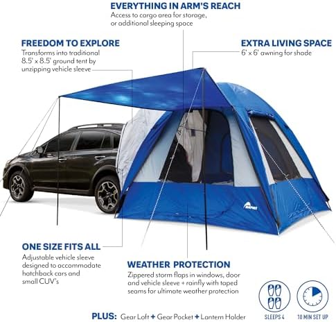 Easy 10 Minute Setup: The simple pole hub design allows for a quick and hassle-free car camping set-up in under 10 minutes.Seamlessly connect your car camping tent to the cargo area of your vehicle to create additional space, storage and access to power to charge your devices. Plus, the adjustable vehicle sleeve is designed to accommodate hatchback cars and small CUVs.