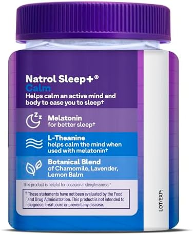 Plus up your sleep with Natrol Sleep+ Calm Melatonin Gummies for better sleep and calms the mind.(1) Natrol Sleep+ Calm helps calm an active mind and body and ease you to sleep.(1) These gummies are 100% drug-free, made with clean ingredients, no synthetic dyes, artificial flavors or sweeteners. This vegetarian, gelatin-free and non-GMO sleep support supplement excludes common food allergens. Made with 99% pure Melatonin, L-Theanine, Chamomile, Lavender and Lemon Balm. Natrol Sleep+ Calm is a 100% drug free sleep support for better sleep.(1) These gummies are pectin based, so they are less sticky than gelatin gummies, offering a delightful strawberry flavor that everyone will love. Adults, take two gummies 30 minutes before bedtime. Natrol is dedicated to creating innovative, quality products, to help you maintain good health and thrive in your busy, modern lifestyle. (1)These statements have not been evaluated by the Food and Drug Administration. This product is not intended to diagnose, treat, cure or prevent any disease.