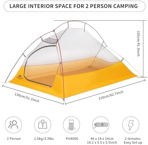 Ultralight Tent for 2 Person: Total weight about 3.3lbs(1.5kg) , Net weight under 3lbs excluded pegs & wind ropes; Super light 2 person tent for backpacking, camping ,hiking,climbing, trekking, cycling, bikepacking etc. Naturehike’s lightest 2 person tent! And the tent packs up fairly small:18.1 x 5.5 x 5.5inch, fits your backpack with plenty of room for other camping gears.