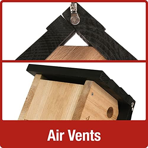 Nature’s Way Cedar Wren House is made with premium Cedar and stainless steel rust-free hardware for a durable house that will last multiple seasons. Air vents allow for proper air ventilation through wall and floor openings to promote bird health. Clean-out doors provide easy access for cleaning. Vinyl-coated wire hanging cable included. This house has a 1 1/8″ opening to accomodate both house wrens and chickadees while keeping unwanted larger birds out.