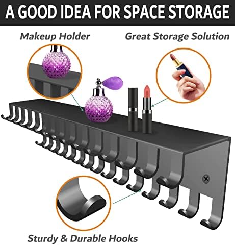 Necklace for Wall Organized: Hanging metal jewelry organizer with 30 hooks, below the shelf, allow for a variety of lengths and styles of necklaces and bracelets to be stored. The top shelf provides space to store earrings, perfume, lipstick, and other cosmetics.