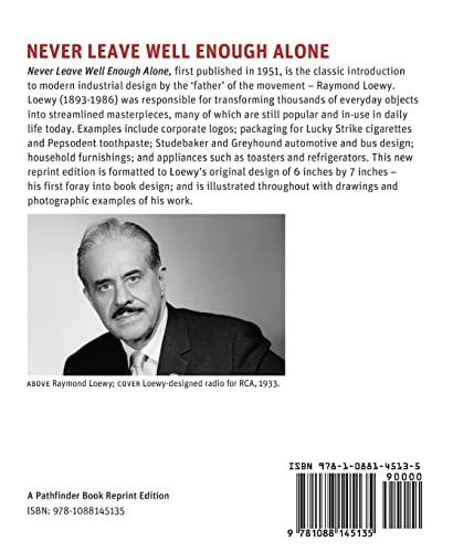 Never Leave Well Enough Alone, first published in 1951, is the classic introduction to modern industrial design by the ‘father’ of the movement – Raymond Loewy. Loewy (1893-1986) was responsible for transforming thousands of everyday objects into streamlined masterpieces, many of which are still popular and in-use in daily life today. Examples include corporate logos; packaging for Lucky Strike cigarettes and Pepsodent toothpaste; Studebaker and Greyhound automotive and bus design; buildings and household furnishings; and appliances such as toasters and refrigerators. This new reprint edition is formatted to Loewy’s original design of 6 inches by 7 inches – his first foray into book design; and is illustrated throughout with drawings and photographic examples of his work.