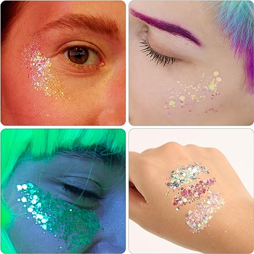 💎【Easy to Apply and Remove】With the included makeup glue, applying the face jewels and body chunky glitter is quick and easy. Please use the makeup remover to remove the makeup glue. Note: Make sure the place where you stick is clean and free of dust, otherwise it will affect the adhesion. The flat surface will stick on better. The face gems are also reusable, clean them after your first-time use, they can be applied again by using the body glue.