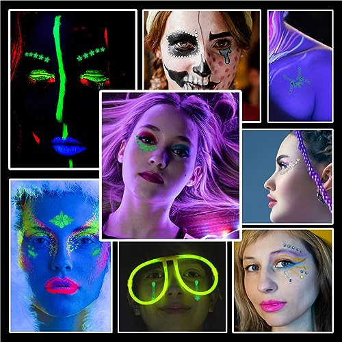 💎【Illuminate Your Beauty】The Ultimate Glow Party Set: Super bright glow temporary tattoo set includes 12 sheets of body gem stickers glow in the dark, 3 colors 15g UV Black Light Glitter chunky face glitter(Loose Glitter), and 5g body glue. Our body jewels come with adhesive on the back, are easy to adhere and they stay on pretty well, also, you can use DECOYARDOO eyelash glue(glitter glue) for use on heavy makeup or while sweating. You can apply chunky face glitter with DECOYARDOO body glue.