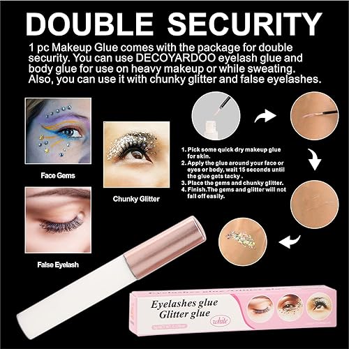 💎【Secure and Stunning】 Complete your look with confidence using the 15g chunky Glitter that emits a mesmerizing glow, and the 5g Body Makeup Glue included in the rave accessories set. Whether it’s attaching false eyelashes, rhinestone face jewels, or various sizes of face glitter, our adhesive ensures a long-lasting and flawless hold. DECOYARDOO temporary tattoos kit enhances your look and adds a touch of sparkle to your face and body with these luminous particles.
