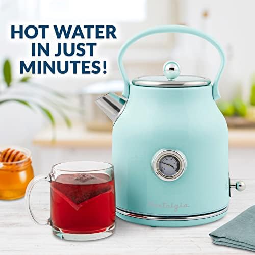 Nostalgia Retro Stainless Steel Electric Tea and Water Kettle, 1.7 Liters, Auto-Shut Off & Boil-Dry Protection, Water Level Indicator Window, Aqua