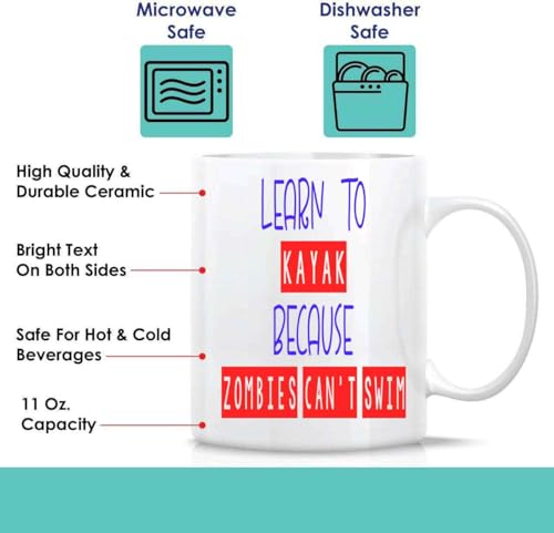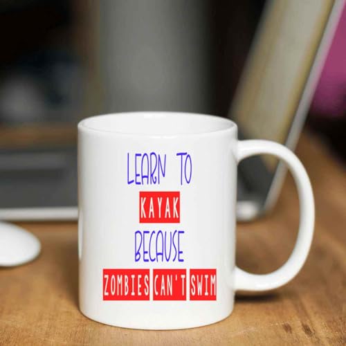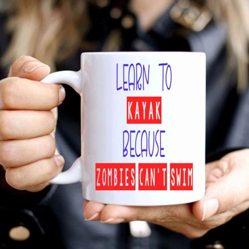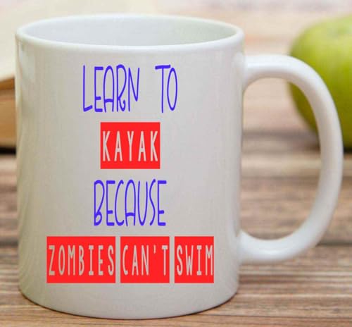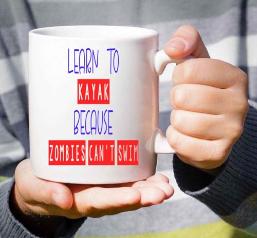 Novelty Gift Survivor Gift Idea for Beginner Kayak Paddlers – Learn To Kayak & Survive Zombies Quote on 11 Oz White Ceramic Coffee Mug