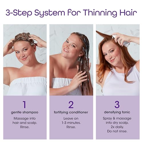 Step 1 Gentle Shampoo – Massage & RinseStep 2 Fortifying Conditioner- Apply & RinseStep 3 Densifying Tonic – Spray & Massage 2X Daily
