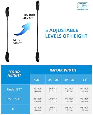 OCEANBROAD Adjustable Fishing Kayak Paddle – 94in/240cm-98in/250cm-102in/260cm Aluminum Alloy Shaft with Paddle Leash