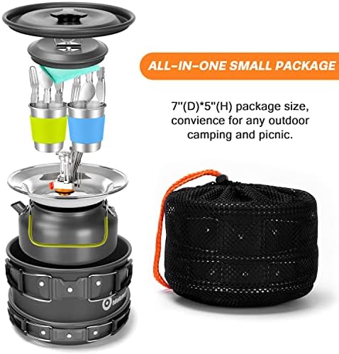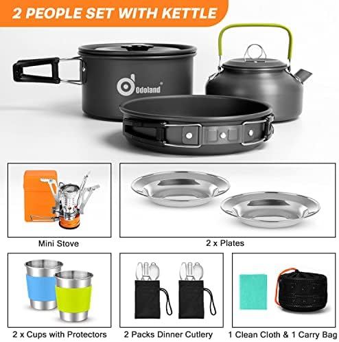 Odoland 16pcs Camping Cookware Set with Folding Camping Stove, Non-Stick Lightweight Pot Pan Kettle Set with Stainless Steel Cups Plates Forks Knives Spoons for Camping Backpacking Outdoor Picnic
