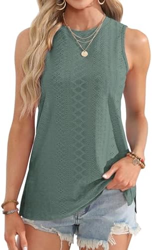 OFEEFAN Tank Top for Women Crewneck Loose Fit Basic Casual Summer Eyelet Sleeveless Tops Side Split