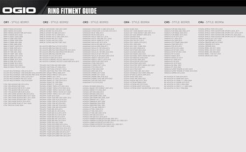 OGIO tank bag rings are made in the USA by collab partner RAM MOUNTS®. Engineered to fit most major motorcycle brands, OGIO tank bag rings are designed to install easily and maintain their shape for years of on-off use. RAM™, a global leader in mounting systems, produces OGIO tank bag rings at their Seattle, WA manufacturing facility. OR3 Tank Ring (Fits most Kawasaki)* Kawasaki Concours 14 ABS 2010-2018, Kawasaki Concours 14 ZG1400 2010-2013, Kawasaki ER-6F 2006-2014, Kawasaki ER-6n 2005-2014, Kawasaki Ninja 1000 2011-2014, Kawasaki Ninja 1000 ABS 2011-2018, Kawasaki Ninja 1000R 2011-2012, Kawasaki Ninja 650 2012-2016, Kawasaki Ninja 650 ABS 2013-2016, Kawasaki Ninja 650R 2006-2011, Kawasaki Ninja ZX-10R 2004-2016, Kawasaki Ninja ZX-14R 2012-2015, Kawasaki Ninja ZX-6R 1995-2012, Kawasaki Ninja ZX-6R ZX636 2003-2018, Kawasaki Versys 1000 2012-2014, Kawasaki Versys 1000 LT 2015-2018, Kawasaki Versys 650 2007-2014, Kawasaki Z1000 2003-2013, Kawasaki Z1000SX 2011-2016, Kawasaki Z750 2004-2012, Kawasaki Z750S 2005-2007, Kawasaki Z800 ABS 2016, Kawasaki Z900RS ABS 2018-2023, Kawasaki Z900RS Cafe ABS 2018-2023, Kawasaki ZZR1200 2002-2005, Honda CB1000R 2008-2016, Honda CB600F 599 Hornet 2007-2012, Honda CB900F 919 2002-2007, Honda CBF1000 2006-2010, Honda CBF600S 2006-2012, Honda CBR1000RR 2008, 2009, Honda CBR1000RR ABS 2008-2009, Honda CBR600F 2011-2012, Honda CBR600F4I 2001-2006, Honda CBR600RR 2005-2009, Honda CBR929RR 2000, 2001, Honda NT700 ABS 2008-2011, Honda NT700V 2008-2012, Honda ST1300 2003-2015, Honda ST1300 ABS 2003-2018, Honda VFR1200 2010-2015, Honda VFR1200 DCT 2010-2014, Honda VFR800A Interceptor ABS 2002-2011, Honda VFR800A Interceptor ABS (Anniv. Ed.) 2002-2011, Honda VFR800 Interceptor 2002-2011, Honda VFR800 Interceptor (Anniv. Ed.) 2002-2011, Honda VTR1000 Super Hawk 2001-2005