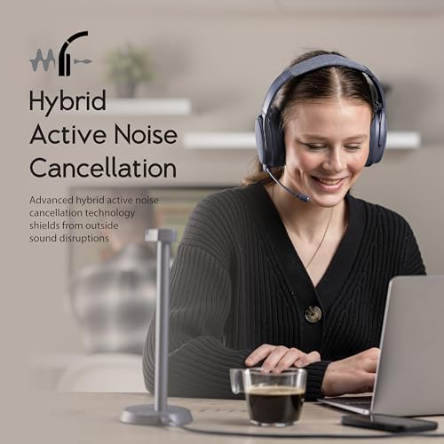 ONANOFF Fokus+ Hybrid ANC Noise Cancelling Bluetooth Headset, 50H Playtime, Included Headphone Stand Wirelessly Charges Your Headphone, Removable Boom Mic, for Home Office Work Travel (Midnight Blue)