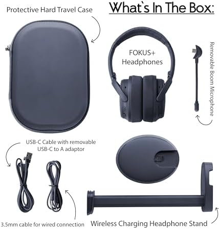 WHAT’S INCLUDED: Focus+ Headphones, Wireless Charging Stand, Hard Case for Storage/Travel, Detachable Boom Mic, 3.5mm cable for wired use, USB-C charging cable, USB-C to USB-A adaptor.