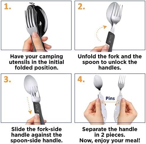🍴 NO MORE BULKY OR BROKEN CUTLERY – Take the hassle out of eating when backpacking, hiking, or fishing. Ditch flimsy disposables or bulky silverware with our 4-in-1 tactical backpacking utensils.