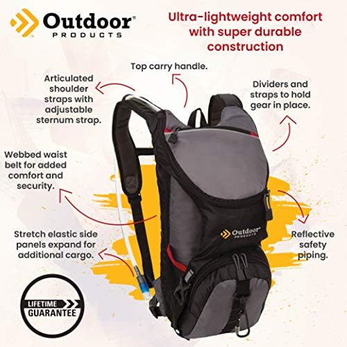 Great for endurance biking, motorcycle hare scrambles, and more, the Outdoor Products Ripcord Hydration Pack provides quick access to water and gear. Four zippered pockets organize supplies with dividers and straps to hold gear in place. The pack includes a two-liter reservoir for hands-free hydration, and insulated tubing attaches to either left or right shoulder strap.