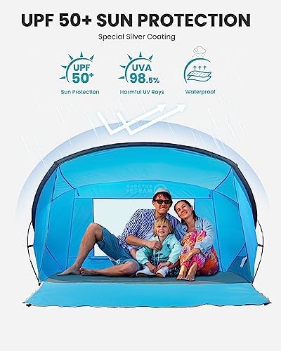 UPF 50+ PROTECTION & WEATHER PROOF: Our beach tent is made of premium 210T sun-proof material coated polyester, it can effectively block heat and 98.5% of the harmful UV rays. Rated 4000mm PU coating, this beach tent is completely weather proof, ensuring you stay dry even during rain or light snow.