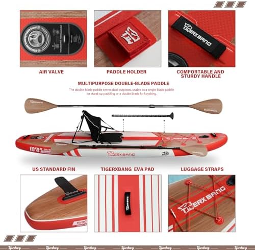【Ergonomic and Portable Design】Tigerxbang Inflatable SUP Attention to comfort is evident in the upgraded Kayak seat with extended wings for better back support, and the ergonomically designed backpack with added padding and a waist buckle for easy transport. These elements make carrying and using the paddle board a comfortable and enjoyable experience.