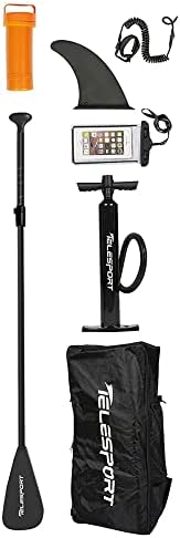 Includes 1 elastic leash, 1 removable fin, 1 adjustable paddle, 1 pump with gauge, 1 waterproof sun case, 1 storage sack, and 1 repair kit