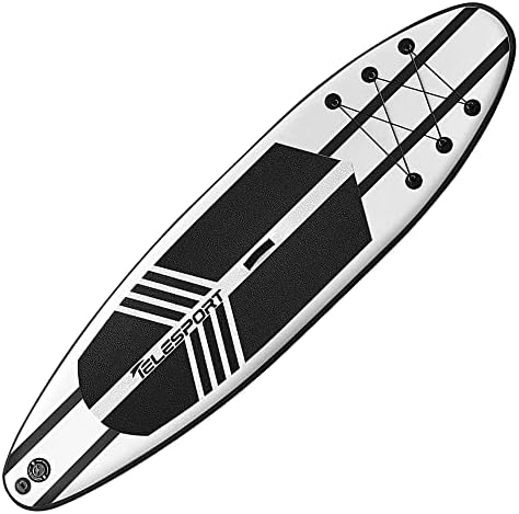 Enjoy a lazy day floating down the river or relaxing on the lake with the Inflatable Stand Up Paddleboard by TELESPORT. Featuring all the accessories you need for a fun-filled day on the water, the SUP board set ensures you’re ready for anything. Fully-inflatable, the high-quality paddleboard rolls to a compact size for easy storage and transportation, perfect for long trips. At your destination, the board quickly inflates with the included pump, filling to 10 to 15 pounds per square inch. The solid EVA dual-layer foam deck makes for a comfortable and sleek place to sit or stand, and your belongings store safely in the bungee snaps on the front end. 3 bottom fins help you maneuver waters, and an attachable large fin provides extra stability when necessary. With an adjustable paddle that extends from 5 feet 3 inches to 6 feet 9 inches, you can tackle any watery environment with ease. Fully equipped with a variety of accessories, the kit includes 1 elastic leash, 1 removable fin, 1 adjustable paddle, 1 pump with gauge, 1 waterproof sun case, 1 storage sack, and 1 repair kit. Enjoy a summer day on the water with the TELESPORT Inflatable Stand Up Paddleboard.