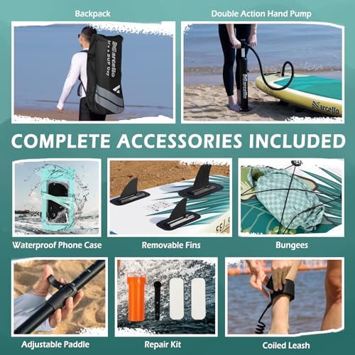 Complete Paddle Board Accessories—our paddle board includes all the essential accessories: 1 paddle board , 1 hand pump, 1 backpack, 1 ankle lead, 1 removable centre fin, 1 kit.
