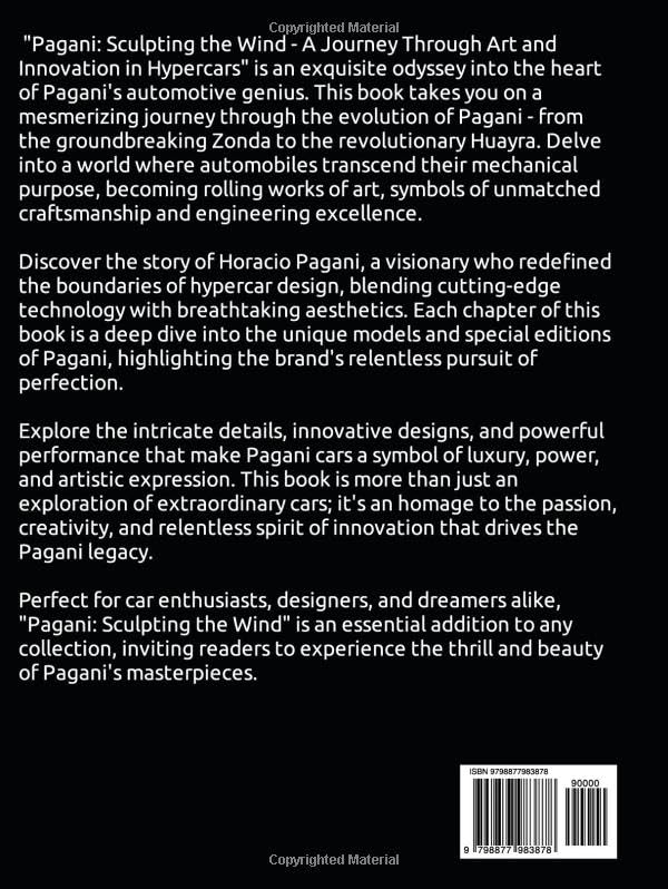 “Pagani: Sculpting the Wind – A Journey Through Art and Innovation in Hypercars” is an exquisite odyssey into the heart of Pagani’s automotive genius. This book takes you on a mesmerizing journey through the evolution of Pagani – from the groundbreaking Zonda to the revolutionary Huayra. Delve into a world where automobiles transcend their mechanical purpose, becoming rolling works of art, symbols of unmatched craftsmanship and engineering excellence.