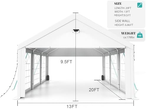 🥳Spacious Design: Measuring L13xW20xH10 FT,this party tent offers ample space for hosting gatherings, parties, or events. The six french windows allow natural light to enter while maintaining a comfortable atmosphere inside