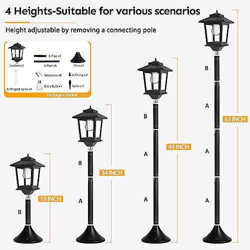 【EASY INSTALLATION】These solar lamp post are NOT electricity needed, and the attached screws can be used on the cement floor to fix the base. The attached pointed posts/U-shaped metal tube can be used on the lawn. Height adjustable by removing a connecting pole. Elegant and easy to use.