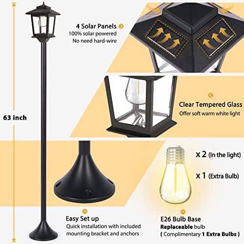 【WIDE USAGE & DECORATIVE】With Warm White Edison Bulb and a height of 63 inches, the solar lamp post light is a great addition to your flower gardens. It’s also a nice little guiding light at the end of your patio. Solar pole lights outdoor can be placed in Backyards, Porches, Pathway, Front/Back Door. Solar light poles for outside will bring you different decoration experience.