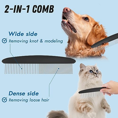 【2-in-1 Comb】: Wide sided for comb knot, smoothing and modeling your pet’s hair, dense side for removal of loosen hair, you can use it on the legs, head or tail of your pets where the brush can’t. Perfect metal comb for dogs, dematting comb for cats deshedding tool for dogs.