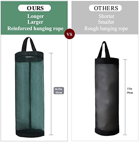 UPGRADE DESIGN and MULTIPLE PURPOSE. After collecting customer opinions, we design our plastic bag organizer LONGER (16.5 inch) and LARGER(80+ bags). Our trash bag holder is great for recycling and organizing, which is ideal for bag organizer for kitchen plastic bag storages, like toring plastic bags, shopping bags, toilet and kitchen rolls at home. It can also use hold vegetables like tomatoes or potatoes for shopping.