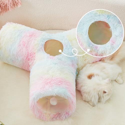 Plush Pet Cat Tunnel Tube Cat Toys 3 Way Collapsible, Cat Tunnels for Indoor Cats,Kitty Tunnel Bored Cat Pet Toys Peek Hole Toy Ball Cat, Puppy, Kitty, Kitten, Rabbit Rainbow