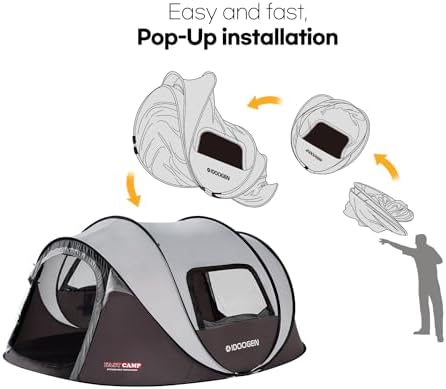 👪【Roomy 4-5 People tent】The size of pop-up tents for camping is 102.3″L x 74.8″W x 43.3″H, which fits for 4-5 people. It has two doors and two windows, each of which has two fasteners, which can effectively protect privacy when pulling up two fasteners.