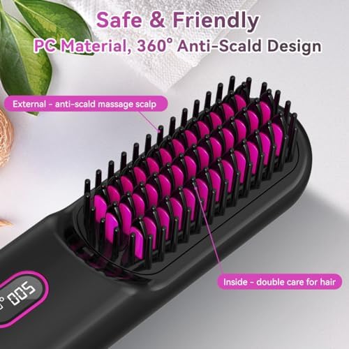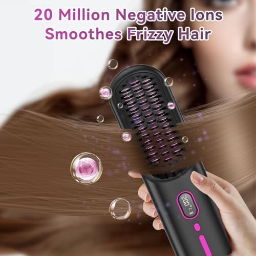 Portable Cordless Hair Straightener Brush with LED Temperature Display, Mini Negative Ion Hot Comb Hair Straightener with 2 Hair Clips, USB Charging,360°Anti-Scald, Easy to Carry for Traveling