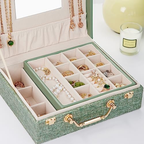 Portable Jewelry Box Organizer for Women Girls with PU Leather, Earring Organizer Box with Makeup Mirror for Christmas and New Year Gifts(Green)