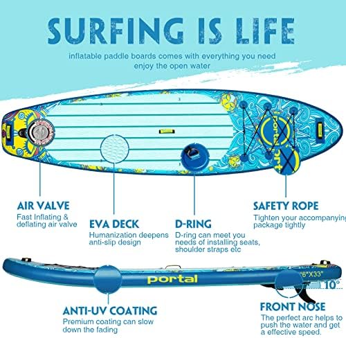 PORTAL SUP Inflatable Stand up Paddle Board for Adults with ISUP Accessories & Backpack, Non-Slip Deck, Leash, Hand Pump, Adjustable Paddle, Fin, Repair Kit, Waterproof Phone Bag