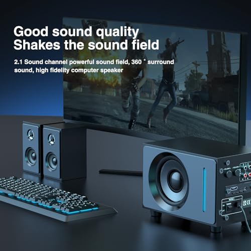 【Larger subwoofer】 2.1 Computer Speaker System with 5.5-inch subwoofer and 2.5-inch mid-treble full-range satellites, 60W rated power/400W peak power, rich and thick bass with high-pitched powerful tweeter, wide stereo sound, Ideal for playing games, watching movies, listening to music.