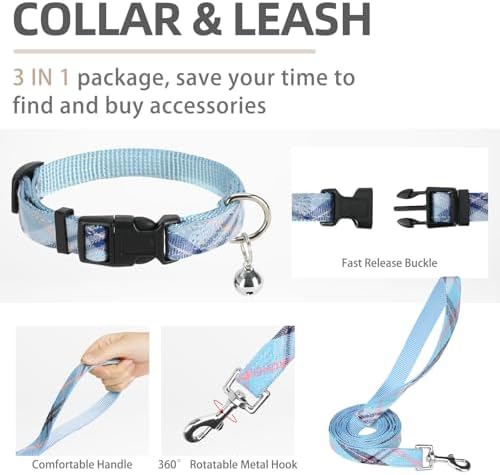 [DOG HARNESS, COLLAR & LEASH] – The package includes three items, a walking harness, a collar, and a 4.9ft matching leash. The collar is with bell, the leash is equipped with a 360-degree rotation metal hook, and the harness is adopted with a quick-release buckle and double D-rings which are very heavy-duty. You don’t need to spend extra time looking through other accessories, but you get all of these items at the same time with less money! So this is a very cost-effective set.