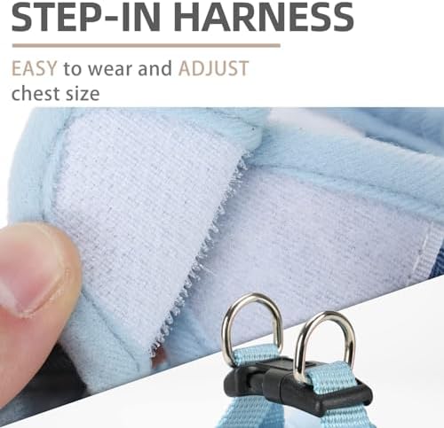 [STEP IN, NO PULL, NO CHOKE] – The harness is adopted magic strap closure, so it’s very easy for wearing. Just open the harness, let your dog’s front legs through the harness, then reclose the closure and buckle it up, and connect the leash with double D-rings, finished! Cushioned design reduces neck friction, and the metal D-ring easily links to leash hooks, not easy to swing, preventing suffocation and pull.