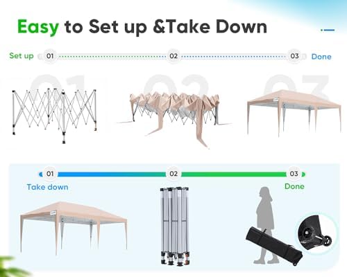 💥[Premium Quality]: The top of the pop up canopy 10×20 is made of 420D Oxford fabric, with PU-coating, waterproof, and SPF 50+ UV sun protection. Our pop up tent is 10×20 with a durable anti-corrosion-resistant powder-coated steel frame. Just only need one or two people to finish it in a few minutes. With no tools required.