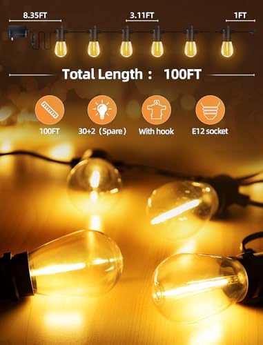 【Energy-Saving & Safety】Outdoor String Lights are 100 feet in total length with 3.11 feet bulb spacing, 9.2 feet lead length, 30+2 (spare) shatterproof S14 bulbs and 1 remote control. End-to-end linkable. Outdoor lights for yard use an e12 socket base and use LED technology to save energy and last longer than traditional tungsten bulbs!