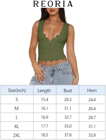 REORIA Womens Sexy V-Neck Sleeveless Double Lined Going Out Y2K Trendy Lace Cropped Tank Tops
