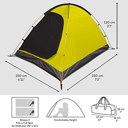 SPACIOUS TWO PERSON TENT – With a center height of 3’7’’ and a floor size of 4’11” x 7’2”, this tent leaves plenty of room for two people or extra space if you’re hiking alone. This roomy tent leaves space for a Full Size (54×75’’) air mattress or cot.